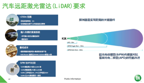 安森美的激光產(chǎn)品有單點的,例如在醫(yī)療、工業(yè)、汽車都有應(yīng)用,還有新開發(fā)出來的陣列,1×12或1×16,下一代的激光雷達都會用到這樣的產(chǎn)品。最新開發(fā)出來的叫做SPAD面陣,是400×100,已經(jīng)不是點云了,已經(jīng)和圖像傳感器差不多,相當(dāng)于是一個圖像,將來完全可實現(xiàn)有深度信息的圖像。