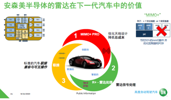 毫米波雷達的適用范圍有:L1、L2、L3、L4、L5。在不同自動駕駛的級別上有不同的應(yīng)用。安森美下一代毫米波雷達產(chǎn)品的重點是放在L3上,安森美將其稱作“MIMO+”。據(jù)悉,作為新開發(fā)的專利技術(shù),它能夠提供4D的信息,R是距離,V是速度,A是角度,E是高度,能夠提供四維信息,用于L3層級的自動駕駛。