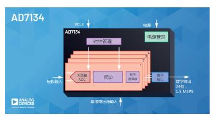 AD7134是一款四通道24位精密ADC,輸出數(shù)據(jù)速率的范圍為10SPS至1.5MSPS。其本身具備高達102 dB的抗混疊能力,無需使用外部抗混疊濾波器,因此所需無源元件和有源元件分別減少60個和5個。相比典型的替代方案,電路板面積縮小70%。異步采樣速率轉換器可以簡化多器件同步,讓用戶能夠輕松實現(xiàn)穩(wěn)定的采樣系統(tǒng),并簡化隔離要求。