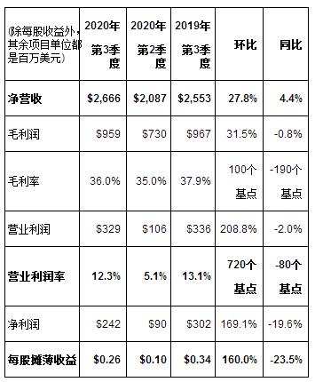 ·第三季度凈營收26.7億美元;毛利率36.0%;營業利潤率12.3%;凈利潤2.42億美元