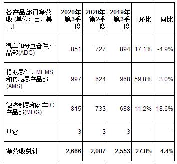 凈營收總計26.7億美元,同比增長4.4%。與去年同期相比,汽車產品、影像芯片和功率分立器件收入雖有所下降,但是微控制器、射頻通信、MEMS和模擬器件銷售收入增長抵消了部分降幅。OEM銷售收入同比增長7.5%;代理渠道銷售收入同比下降3.4%。從環比看,凈營收增長27.8%,比公司預期最高目標高690個基點。所有產品部門都實現銷售收入環比兩位數增長。