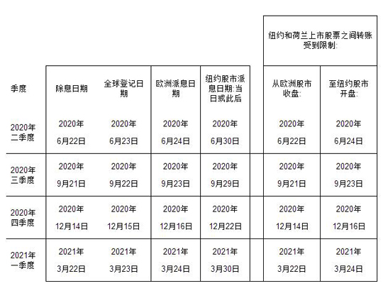 在2020年第二、三、四季度和2021年第一季度期間,向每個季度當月在冊股東派發公司普通流通股每股0.168美元現金股息,按照下表分四個季度每季度0.042美元派發;