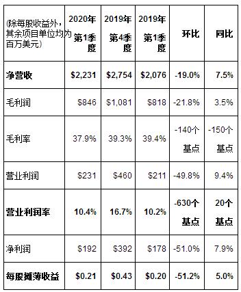 營業利潤總計2.31億美元,比去年同期的2.11億美元提高9.4%。營業利潤率同比下降20個基點,占凈營收10.4%,而2019年第一季度為10.2%。