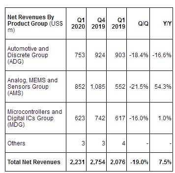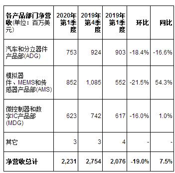 ·“2020年第一季度凈營收同比增長7.5%,影像產品銷售收入漲幅居前,其次是模擬器件和微控制器,而汽車、功率分立器件和數字產品的銷售有所下降。營業利潤率增至10.4%,凈利潤增長7.9%,達到1.92億美元。