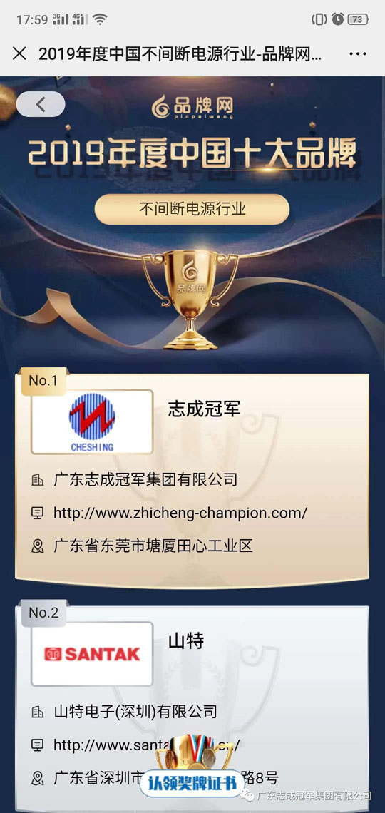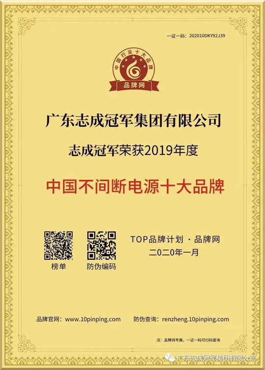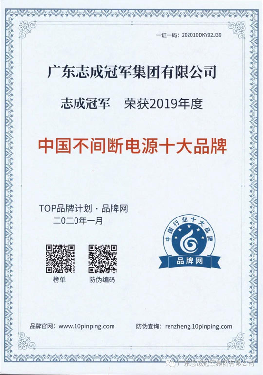 2019年12月下旬至2020年1月上旬,在經過為期一個多月的評比以及公示后,廣東志成冠軍集團有限公司“志成冠軍”品牌以榜單第一名的成績,榮獲2019年度中國不間斷電源十大品牌,并于四月獲得相應證書。