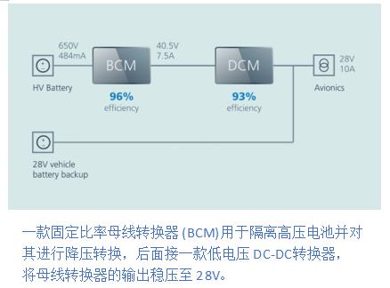 此外,Ampaire設計團隊還要求解決方案體積小、效率高、簡單的熱管理設置,以及快速的原型設計和極短的投產時間。該設計團隊也不希望設計或使用電源轉換器電路板。根據這些設計要求,Vicor工程技術團隊建議分兩個階段進行功率轉換和穩壓,以優化效率和功率密度,簡化熱管理。一款固定比率母線轉換器(BCM)將用于隔離高壓電池并對其進行降壓轉換,后面接一款低電壓DC-DC轉換器,將母線轉換器的輸出穩壓至28V。