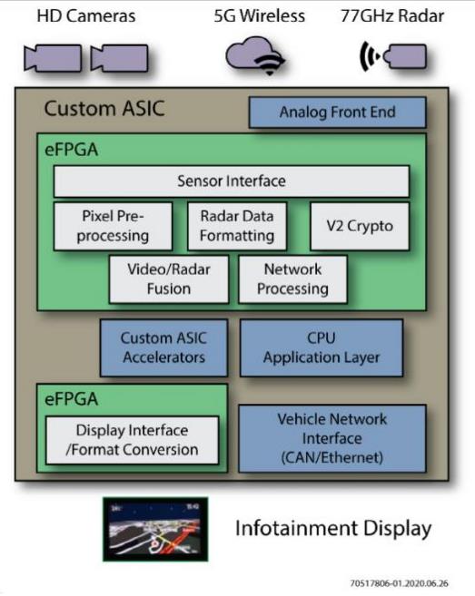 與只提供特定的邏輯密度、內存、資源組合和I/O接口的獨立FPGA芯片不同,eFPGA IP解決方案可以針對特定的汽車工作負載進行完全定制。與獨立的FPGA相比,eFPGA可節省高達90%的成本,并降低高達75%的功耗,同時在開發ASIC之后,還能提供同樣的能力來增加新的硬件功能。例如,改變硬件規格,以提供增強的雷達和攝像頭傳感器融合來滿足創新功能的需求,全新的、更強大的顯示技術,以及全新的圖像傳感器功能等。下面的框圖顯示了集成eFPGA的ASIC可以為汽車制造商提供的一些功能。