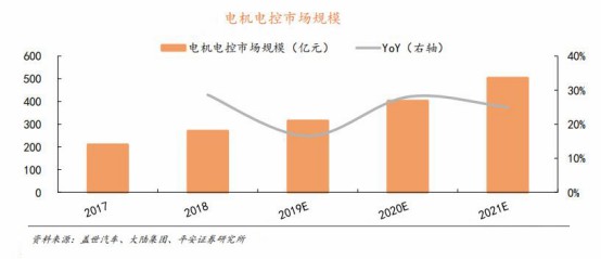 對于2021年國內新能源汽車發展走勢,中汽協預測,2021年,國內新能源汽車產銷同比增速或超30%甚至達到40%,產銷量有望達180萬輛。此外,《新能源汽車產業發展規劃(2021-2035年)》提到,擬到2025年,新能源汽車的新車銷量占比要達到25%左右,如果按照我國每年新車銷售2千萬輛計算,2025年的新能源汽車銷量將要達到500萬輛的水平。屆時,電機電控市場規模將更加可觀。