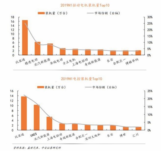 統計顯示,比亞迪依托新能源整車的銷量優勢,其電機電控產品份額遙遙領先。第三方供應商的市場份額較為分散,暫時未見具備龍頭優勢的企業出現。與電機相比,由于電控的制造設備投資更少,同時在配套過程中需要驅動電機、BMS等整車其他部件的參數才能進行調試,與上汽深度綁定的聯合汽車電子在第三方供應商中占據了較多的份額。而隨著合資車企的新能源車型逐步開始投放,國內的電機電控供應商還將面臨來自博世、大陸等外資供應商的競爭,預計在今后一段時間電機電控市場將維持紅海競爭的格局。
