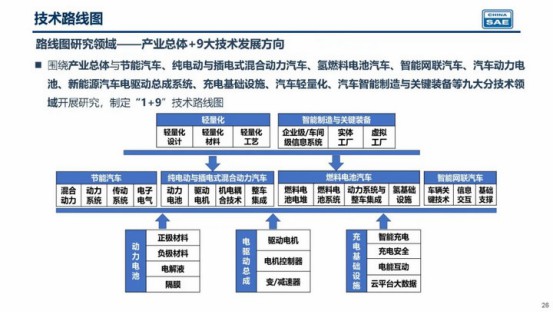 技術路線圖2.0進一步研究確認了全球汽車技術“低碳化、信息化、智能化”發展方向,客觀評估了技術路線圖1.0發布以來的技術進展和短板弱項,深入分析了新時代賦予汽車產業的新使命、新需求,進一步全面描繪了汽車產品品質不斷提高、核心環節安全可控、汽車產業可持續發展、新型產業生態構建完成、汽車強國戰略目標全面實現的產業發展愿景,提出了面向2035年我國汽車產業發展的六大目標,即我國汽車產業碳排放將于2028年先于國家碳減排承諾提前達峰,至2035年,碳排放總量較峰值下降20%以上;新能源汽車將逐漸成為主流產品,汽車產業基本實現電動化轉型;智能網聯汽車產業生態持續優化,產品大規模應用;關鍵核心技術水平顯著提升,形成協同高效、安全可控的產業鏈;建立汽車智慧出行體系,形成汽車、交通、能源、城市深度融合生態;技術創新體系基本成熟,具備引領全球的原始創新能力。科學規劃了“1+9”的技術路線圖,即總體技術路線圖和節能汽車、純電動和插電式混合動力汽車、氫燃料電池汽車、智能網聯汽車、汽車智能制造與關鍵裝備、汽車動力電池、新能源汽車電驅動總成系統、充電基礎設施、汽車輕量化9個細分領域技術路線圖。