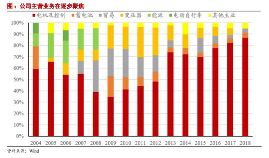 在并購補(bǔ)足短板之際,臥龍也通過自身業(yè)務(wù)的調(diào)整,對主業(yè)的聚焦及生產(chǎn)管理的優(yōu)化而做大做強(qiáng):如剝離非核心主業(yè),在2017年完成了對變壓器業(yè)務(wù)的剝離,使得公司2018年電機(jī)業(yè)務(wù)占收入比達(dá)86.9%,而同時(shí)蓄電池業(yè)務(wù)也逐步淡化,2018年的收入占比也降低至4.3%。