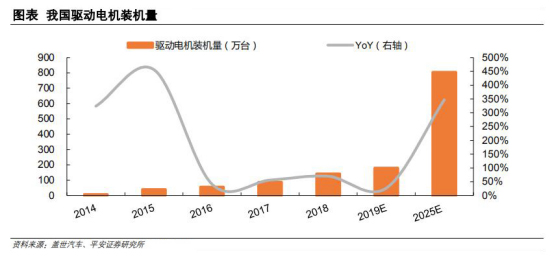 2018年我國新能源汽車銷量為125.6萬臺(tái),預(yù)計(jì)至2025年,新能源汽車銷量將達(dá)到700萬臺(tái),驅(qū)動(dòng)電機(jī)的市場規(guī)模也隨之快速增長。數(shù)據(jù)顯示,2020年初全球新能源汽車電機(jī)電控市場規(guī)模約200億元,其中電機(jī)和電控的價(jià)值量比約4:6,即電機(jī)市場規(guī)模約80億元。而據(jù)此簡單測算,2025年全球新能源汽車電機(jī)市場規(guī)模有望提升至250億元,GAGR超20%。
