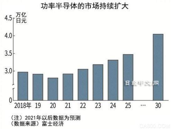 統計數據顯示,預計功率半導體的世界市場規模將從2020年開始持續擴大,在2030年有望增至4.0471萬億日元(折合人民幣2336億),比2020年增長44%。