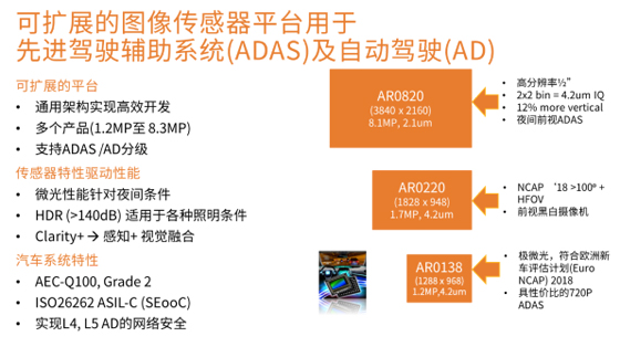 安森美這可擴(kuò)展的圖像傳感器系列包含從130萬像素到830萬像素的多款產(chǎn)品,具有卓越的微光性能和>140 dB的高動(dòng)態(tài)范圍,Clarity+實(shí)現(xiàn)感知+視覺的融合,且都符合AEC-Q100車規(guī)和ISO26262 ASIL-C,采用通用架構(gòu),使汽車OEM充分利用現(xiàn)有器件的軟件和算法,實(shí)現(xiàn)高效開發(fā)。其中,4.2 um的AR0138是高性價(jià)比的720P ADAS攝像頭的理想選擇,超低照,符合歐洲新車評(píng)估計(jì)劃(Euro NCAP);4.2 um的AR0220比AR0138的分辨率稍高;AR0820分辨率最高達(dá)830萬像素,適用于夜間前視ADAS和更高級(jí)別的自動(dòng)駕駛。