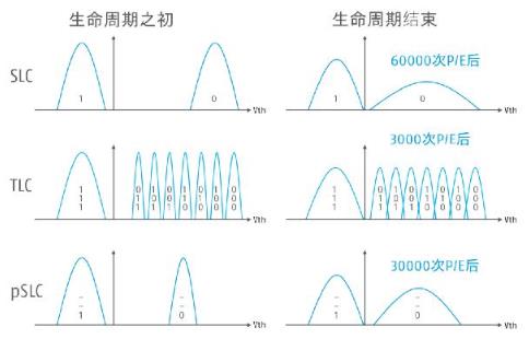 這兩種效應使得pSLC可實現的編程和擦除周期數從TLC的3000提高到了30000到60000之間。這種操作模式使TLC進入了“真正”SLC技術的范圍內。