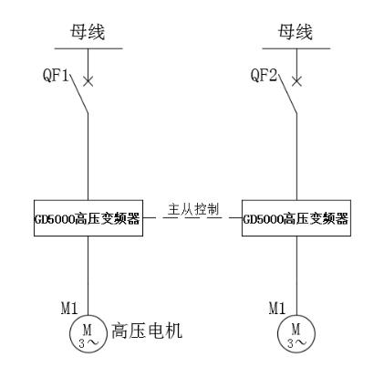 兩臺GD5000變頻器通過主從通訊連到一起,主機(jī)跑速度模式,從機(jī)跑轉(zhuǎn)矩模式,從而保證兩臺機(jī)組出力一樣,兩臺機(jī)組動態(tài)響應(yīng)更加協(xié)調(diào),使機(jī)組運(yùn)行更加穩(wěn)定可靠。