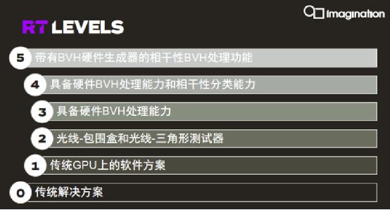 和所有領(lǐng)先廠商一樣,Imagination在長期的持續(xù)研發(fā)中首先總結(jié)出了一套目前業(yè)內(nèi)最為完善的光線追蹤等級系統(tǒng)(Ray Tracing Levels System,RTLS),旨在幫助開發(fā)人員和原始設(shè)備制造商(OEM)清晰了解現(xiàn)在和未來可用的光線追蹤加速解決方案的功能。