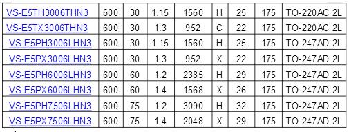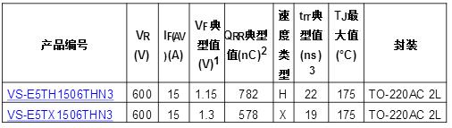 整流器采用TO-247AD和TO-220AC封裝,X型為Hyperfast超高速恢復整流器,H型為Ultrafast超快恢復整流器。X型整流器的優(yōu)點是QRR低,H型整流器的優(yōu)點是正向壓降低。器件符合RoHS標準,無鹵素,工作結溫達到+175°C。