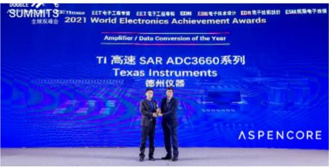 此外,在產(chǎn)品獎項類別,德州儀器高速SAR ADC3660系列以兼具速度和精度的的特點,得到了來自ASPENCORE全球資深產(chǎn)業(yè)分析師以及亞、美、歐洲網(wǎng)站用戶的一致認可,榮獲“年度創(chuàng)新產(chǎn)品獎”類別的“年度放大器/數(shù)據(jù)轉(zhuǎn)換器”稱號。ADC3660系列包括八款分辨率為14、16和18位、采樣速度為10MSPS至125MSPS的高速逐次逼近寄存器(SAR)模數(shù)轉(zhuǎn)換器(ADC)。該器件在超低功耗下動態(tài)范圍依舊出色,可有效支持工程師設(shè)計具有超高動態(tài)范圍和超低延遲、功耗降幅高達65%的高速數(shù)字控制環(huán)路,助力設(shè)計人員在系統(tǒng)設(shè)計中提高信號分辨率、延長電池壽命并增強系統(tǒng)保護功能。