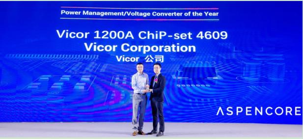 Vicor 中國(guó)技術(shù)支持中心總監(jiān)倪進(jìn)領(lǐng)取電源管理/電壓轉(zhuǎn)換器類別的年度最具創(chuàng)新產(chǎn)品獎(jiǎng)。Vicor 1200A 橫向供電解決方案贏得了該獎(jiǎng)項(xiàng)