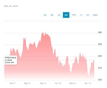 Meta(原Facebook)的股價(jià)在改名前后的元宇宙熱潮中沖高回落