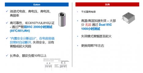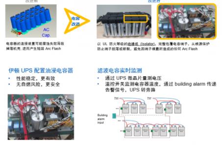 同時對于對溫度特別敏感,同時與UPS安全性,可靠性設計息息相關的濾波電容器件,Eaton UPS全部導入油浸式電容,替代薄膜電容,杜絕因為材料缺陷而引起的電容冒煙,起火等嚴重事件的發生。