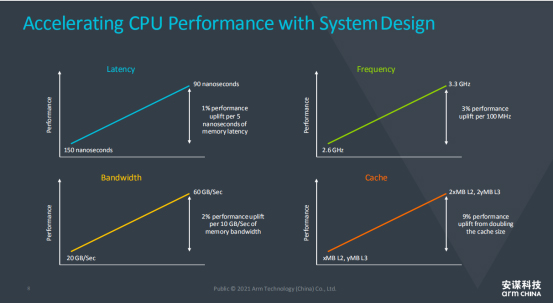 鄒偉先生指出,ARM的全面計算概念,除提升CPU之外,ARM希望得到系統級的提升,達到更好的用戶體驗。這其中涵蓋了,首先是最直觀的頻率的提升,例如一個3GHz左右的CPU,每提升100兆,性能提升了3%;其次是Latency,如果內存的訪問時間降低,系統性能也能提升,當然有些量化的數據,比如減少5納米,性能提升1%。然后是帶寬從20Gb到60Gb,每10Gb大概提升2%的性能,Cache大概能達到9%的性能提升。雖然數據看起來不起眼,但ARM就是經過不斷地慢慢積累,才達到20%到30%的性能提升。