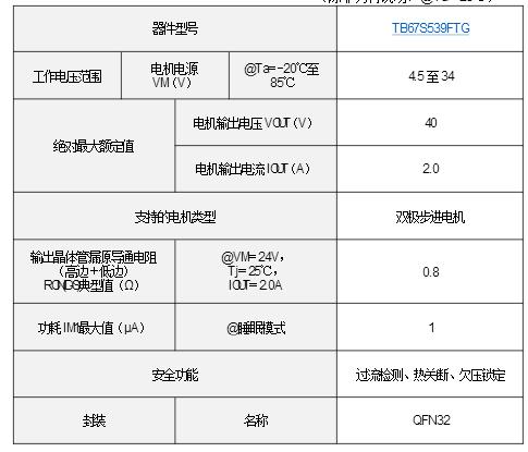 為降低使用過程中的熱耗散,TB67S539FTG采用緊湊型QFN32封裝。輸出晶體管漏源導通電阻(高邊+低邊)低至0.8Ω(典型值),有助于降低產熱。