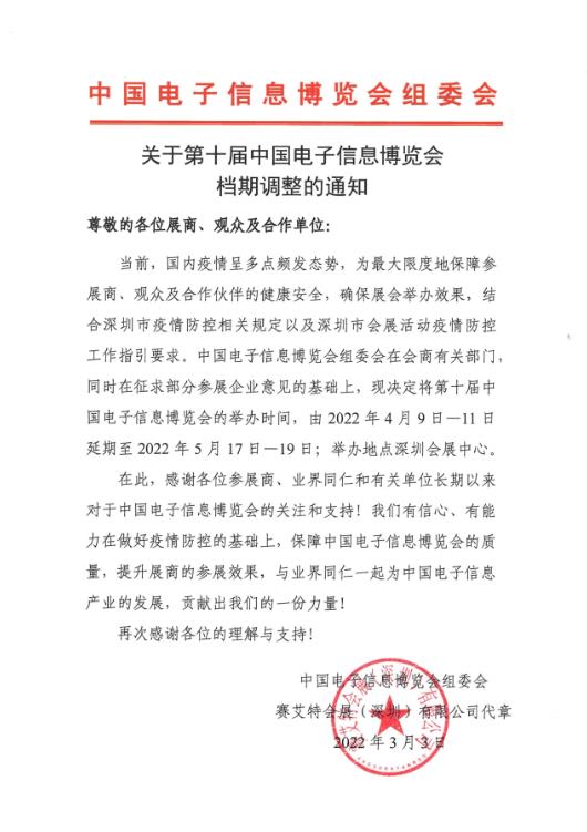 當(dāng)前,國內(nèi)疫情呈多點頻發(fā)態(tài)勢,為最大限度地保障參展商、觀眾及合作伙伴的健康安全,確保展會舉辦效果,結(jié)合深圳市疫情防控相關(guān)規(guī)定以及深圳市會展活動疫情防控工作指引要求,中國電子信息博覽會組委會在會商有關(guān)部門,同時在征求部分參展企業(yè)意見的基礎(chǔ)上,現(xiàn)決定將第十屆中國電子信息博覽會的舉辦時間,由2022年4月9日—11日延期至2022年5月17日—19日,舉辦地點深圳會展中心。