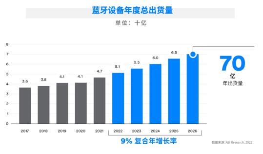 在疫情的沖擊下,2020年對全球許多市場來說是動蕩不安的一年,而2021年,藍牙市場開始迅速反彈至疫情前的增長水平。分析師預測,藍牙市場在2022年從疫情中恢復的速度將快于最初的預測。分析師并預估,未來五年藍牙設備的年出貨量將增長1.5倍,到2026年將突破70億臺。