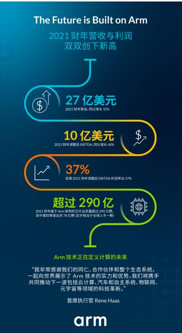 2021財(cái)年基于Arm架構(gòu)的芯片出貨量創(chuàng)下新高,達(dá)292億顆,其中在財(cái)年第四季度出貨近80億顆(78億)。