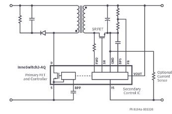 這款簡單的反激式變換器設計集成了碳化硅開關以及初級和次級控制器。InnoSwitch3-AQ IC使用FluxLink™進行隔離,可讓次級控制器成為主控制器。這種不尋常的架構意味著次級側決定何時進行初級開關操作,實現同步整流而沒有通常的缺點(例如,開關時間不正確),并能對所有故障做出響應。