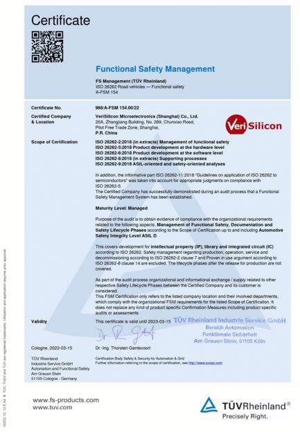 通過審查芯原的整體芯片設計流程及質量管理體系(QMS),德國萊茵TÜV認定芯原的芯片設計及管理流程,包括功能安全性管理過程、軟硬件開發流程、面向ASIL的功能安全分析等,均滿足ISO 26262:2018汽車功能安全標準的各項要求。
