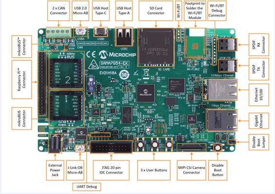 Microchip為SAMA7G54提供硬件和軟件開發支持。SAMA7G54-EK評估工具包(部件編號:EV21H18A)具有連接器和擴展頭,便于定制和快速獲得領先的邊緣嵌入功能。該器件由Microchip的主流Linux發行版支持。MPLAB®Harmony v3提供裸機框架和RTOS支持。