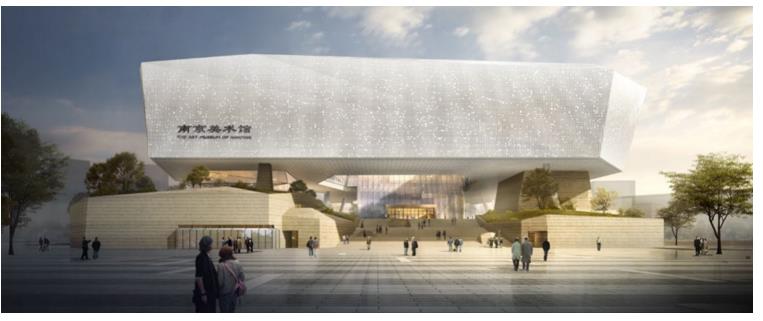 作為城市的一處新地標,南京美術館新館兼具了歷史氣息與現代化理念,其設計以“山水金陵,寫意江北”為創意,“三中心”及輔助業務用房組成基座,美術館新館架空懸浮其上,整個外觀輪廓通過形體抽象與幾何變形,呈現出剛柔并濟之美。