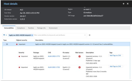 Prisma Cloud用戶可以在漏洞選項(xiàng)卡下識(shí)別受影響的主機(jī)。平臺(tái)會(huì)檢測(cè)熱補(bǔ)丁程序包,并對(duì)運(yùn)行漏洞版本的虛擬機(jī)發(fā)出警報(bào)。如要搜索這些漏洞,可以使用相關(guān)的Amazon Linux Security Advisories(ALAS)ID:ALAS-2021-1554、ALAS-2021-1732、ALAS-2022-1580和ALAS-2022-1773。