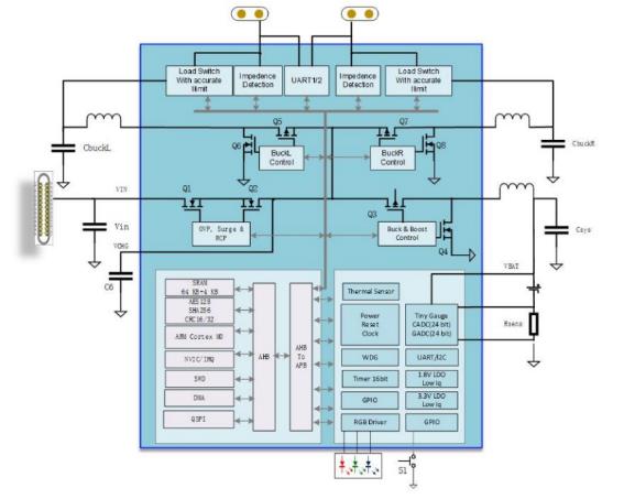 TCPT22集成了包括MCU、Buck、Boost、高精度電量計、保護電路、耳機通訊、出入和檢測及硬件加密等功能。高效同步整流Buck充電和同步整流Boost+Buck放電電路,可實現充電倉電池高達5C和耳機端電池高達10C的快速充電,在對耳機充電時,兩路耳機的供電電壓和電流可以獨立控制,除可以實現恒壓供電外,也可以實現電壓跟隨或恒流恒壓控制實現耳機電池的直流快充,在實現快速充電的同時控制耳機的發熱量,充分滿足充電倉和耳機的快速補電和長續航需求。該方案還集成了耳機出入盒檢測和單線通訊必需的開關和電平轉換電路以實現耳機同充電倉之間快速通訊和固件的在線更新,并且靈活支持2觸點和3觸點耳機接口。基于芯片內部的高精度電壓測量和電流測量信號鏈路和ADC,可以精確估計充電倉電池容量。