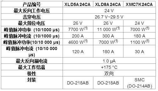 XMC7K24CA系列SMC封裝器件最大箝位電壓低至24 V,10/1000μs條件下峰值脈沖電流(Ippm)高達180 A,相當于常規TVS 7 kW額定功率。XLD5A24CA和XLD8A24CA系列DO218AB封裝器件最大箝位電壓為26 V,10/10 000μs條件下Ippm為120 A和180 A,分別相當于常規TVS 4.6 kW和7 kW額定功率。