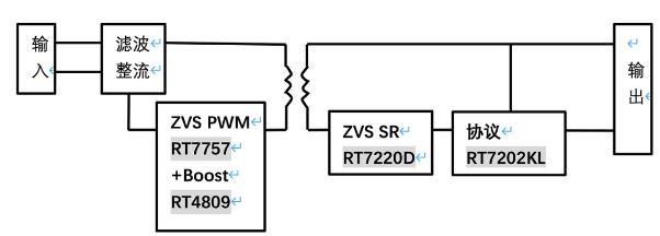 立锜科技(Richtek)是一家先進的模擬IC設計公司,旗下擁有豐富且全面的器件,能夠為電源廠商提供全套的快充解決方案。本方案便由Richtek旗下支持零電壓切換(ZVS)的PWM控制器RT7757,同步整流器RT7220D以及可編程控制器RT7202KLA組成。其中,RT7202KLA是一款包含反饋補償和內部穩壓器的可編程控制器,其內部集成的MCU可通過CC1/CC2/D+/D-接口對各種協議進行處理。