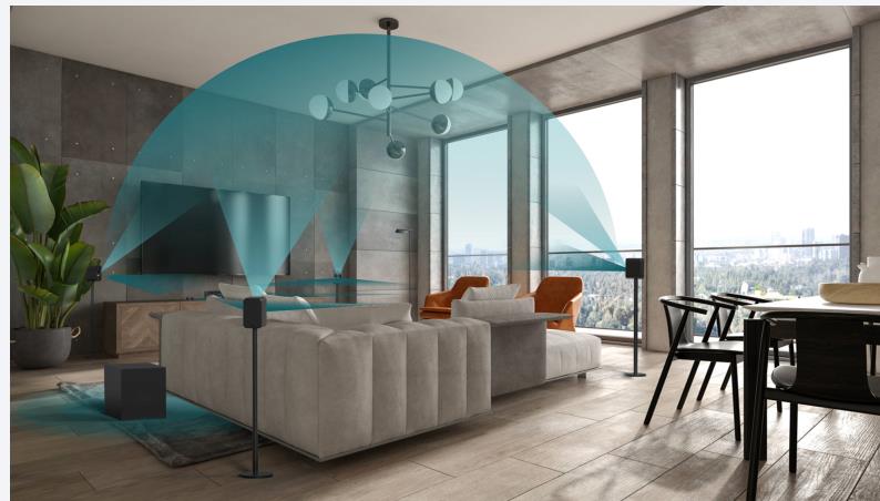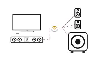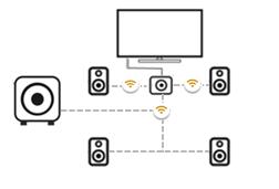 利用智能中心揚聲器通過ARC/eARC連接到高清電視,用無線方式連接2個前置揚聲器,2個后置揚聲器和一個低音炮,以實現一個完整的5.1沉浸式系統。