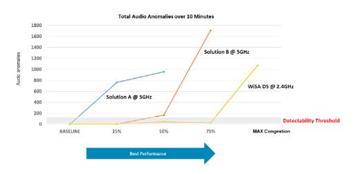 從歷史上看,在擁塞度為50%的環境中能夠運行的無線音頻解決方案即被認為是非常好的方案。WiSA的解決方案能夠在擁塞度為75%的環境中運行,是無線音頻技術的重大突破。