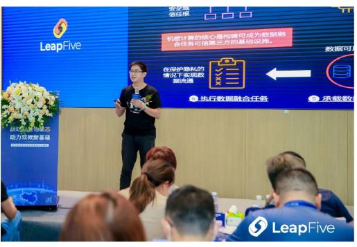 圖3.摩聯(lián)科技聯(lián)合創(chuàng)始人兼CTO許剛介紹與躍昉就數(shù)據(jù)安全(機(jī)密計(jì)算)的合作以及基于NB2方案的機(jī)密計(jì)算卡Demo展示