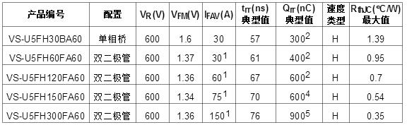 30A/600 V器件采用單相橋式配置,60 A-300 A/600 V-1200 V器件采用雙二極管配置。整流器有X型Hyperfast和H型Ultrafast兩種速度類型。H型整流器的優(yōu)點是導通損耗低,X型整流器的優(yōu)勢在于恢復速度快。器件工作溫度達+175°C。