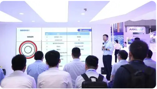CHINAPLAS展臺現場,萬華化學帶來了“以質為核,纜通未來”的主題分享,介紹了線纜絕緣層和護套層產品,以豐富的線纜材料覆蓋線纜行業八成以上的橡塑產品,為行業客戶提供全面系統的一站式解決方案。