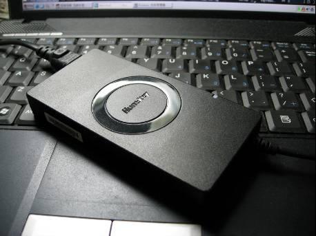 初次拿在手里能感覺到它的確比常見的筆記本電源適配器要薄很多。正面有著“航嘉”的logo。在正面還有一個電源指示燈,散發著并不刺眼的幽幽藍光。