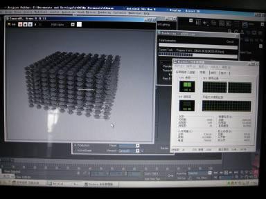 上機測試直接打開3DMAX進行三維動畫的渲染。3DMAX外掛VRAY渲染器可以很好的支持多CPU協同合作。可以看到我的2個CPU已經全速運轉。這時候計算機的耗電量已經達到了頂峰滿負荷。