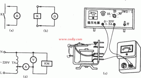 (3)測量直流繼電器吸合、釋放電壓電流。選用一臺0~35V直流穩壓電源,將萬用表打在100mA直流擋,串入繼電器線圈回路中,如圖(c)所示。調節穩壓電源的調壓旋鈕,使電源電壓從低逐漸升高。當剛聽到銜鐵“嗒”一聲吸合時,記下吸合電流和電壓值(用另一電壓表);然而吸合電壓和電流不是很固定的,須多作幾次,取其平均值。然后再調動調壓旋鈕,使電壓下降,至剛聽到“嗒”的一聲,則為繼電器的釋放電壓和電流值。
