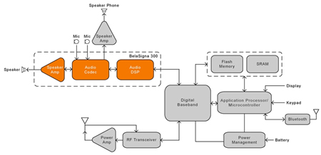圖2: BelaSigna® 300 Hi-Fi音頻處理器在手機和免提電話中的應用電路圖