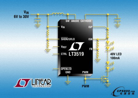 LT3519 在 LED 的高端檢測(cè)輸出電流,從而可實(shí)現(xiàn)降壓、降壓-升壓或升壓型配置。結(jié)合傳統(tǒng)電壓反饋和獨(dú)特的浮動(dòng)電流檢測(cè)反饋,這些轉(zhuǎn)換器可以作為恒定電壓或恒定電流源工作,從而提供最大的設(shè)計(jì)靈活性。其它特點(diǎn)包括:開路 LED 保護(hù)、軟啟動(dòng)和熱保護(hù)。