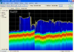 我們還有必要考察一下與繞過預選功能的頻譜儀相比,RSA6120的交換式濾波預選功能怎樣有效地減少放射本振輻射。在下面的實例中,我們使用擁有DPX顯示技術的泰克頻譜儀,把左面的傳統頻譜儀與RSA6120進行對比。上面的藍色頻段表明本振放射。如這里所示,左面的頻譜儀實際上變成一條RF波束。RSA6120A可以顯示最小的本振饋送放射,對被測設備幾乎沒有影響,使用掃描接收機很難檢測到。■